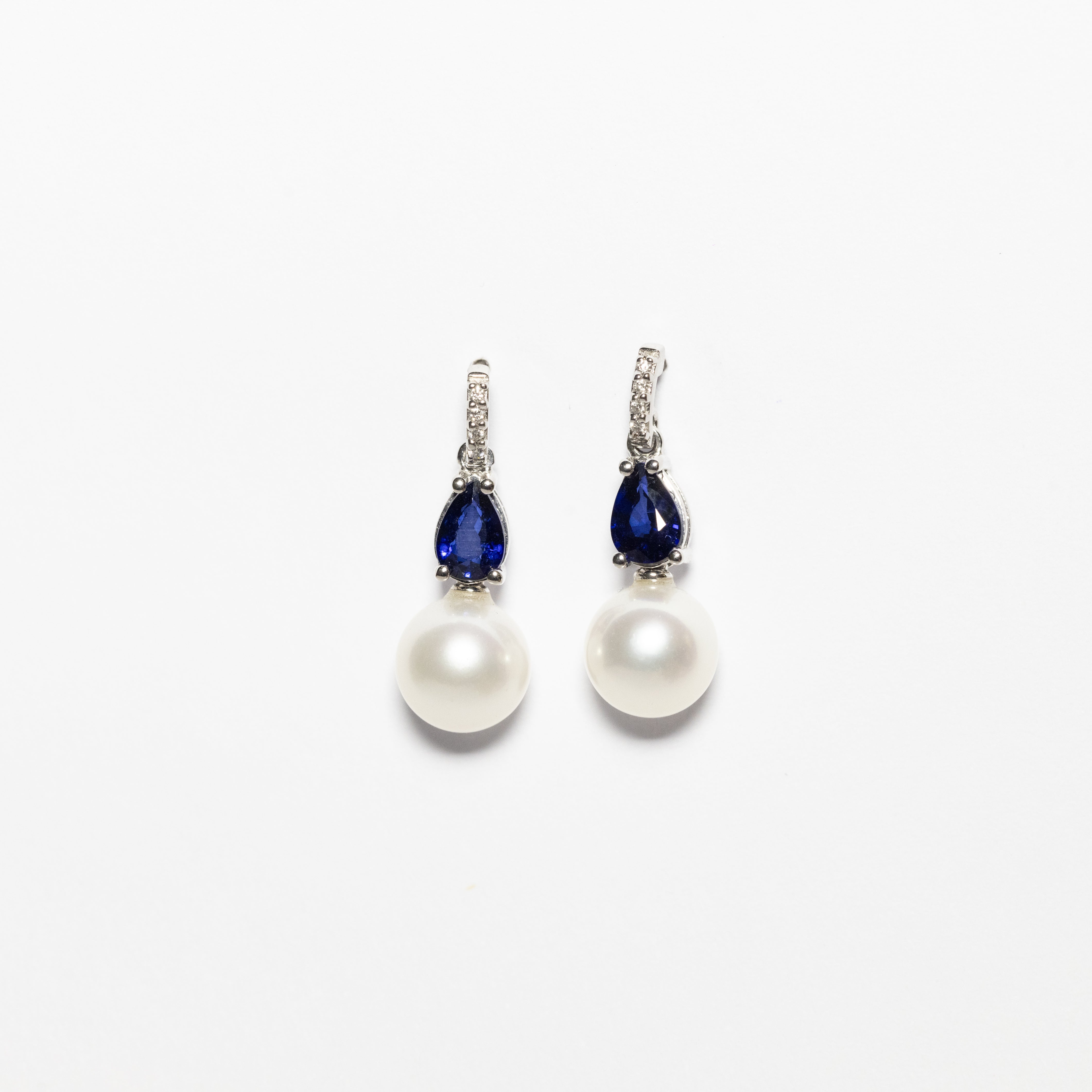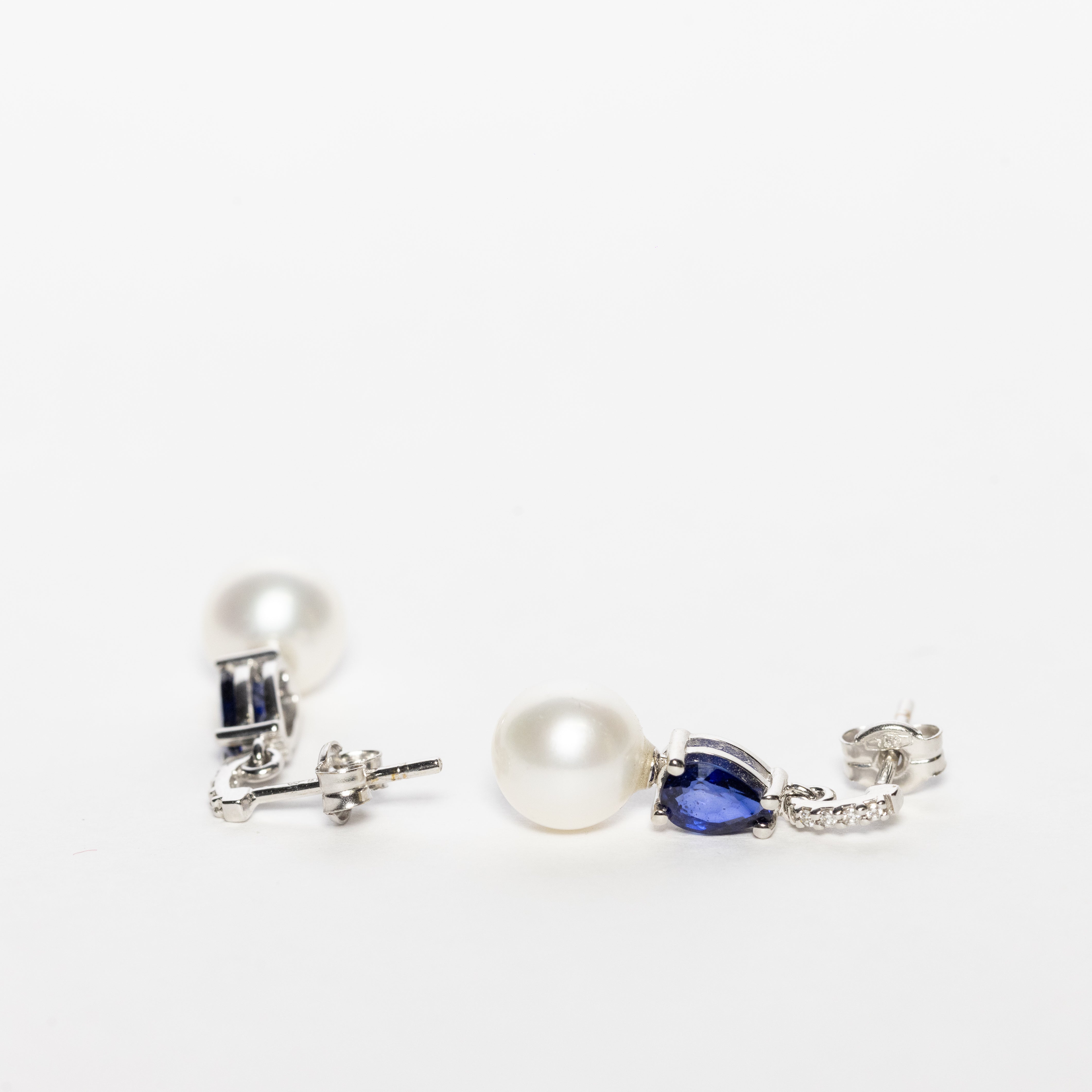 ORECCHINI IN ORO BIANCO 18 KT CON PENDENTI DI ZAFFIRO TAGLIO GOCCIA, PERLA E DIAMANTI