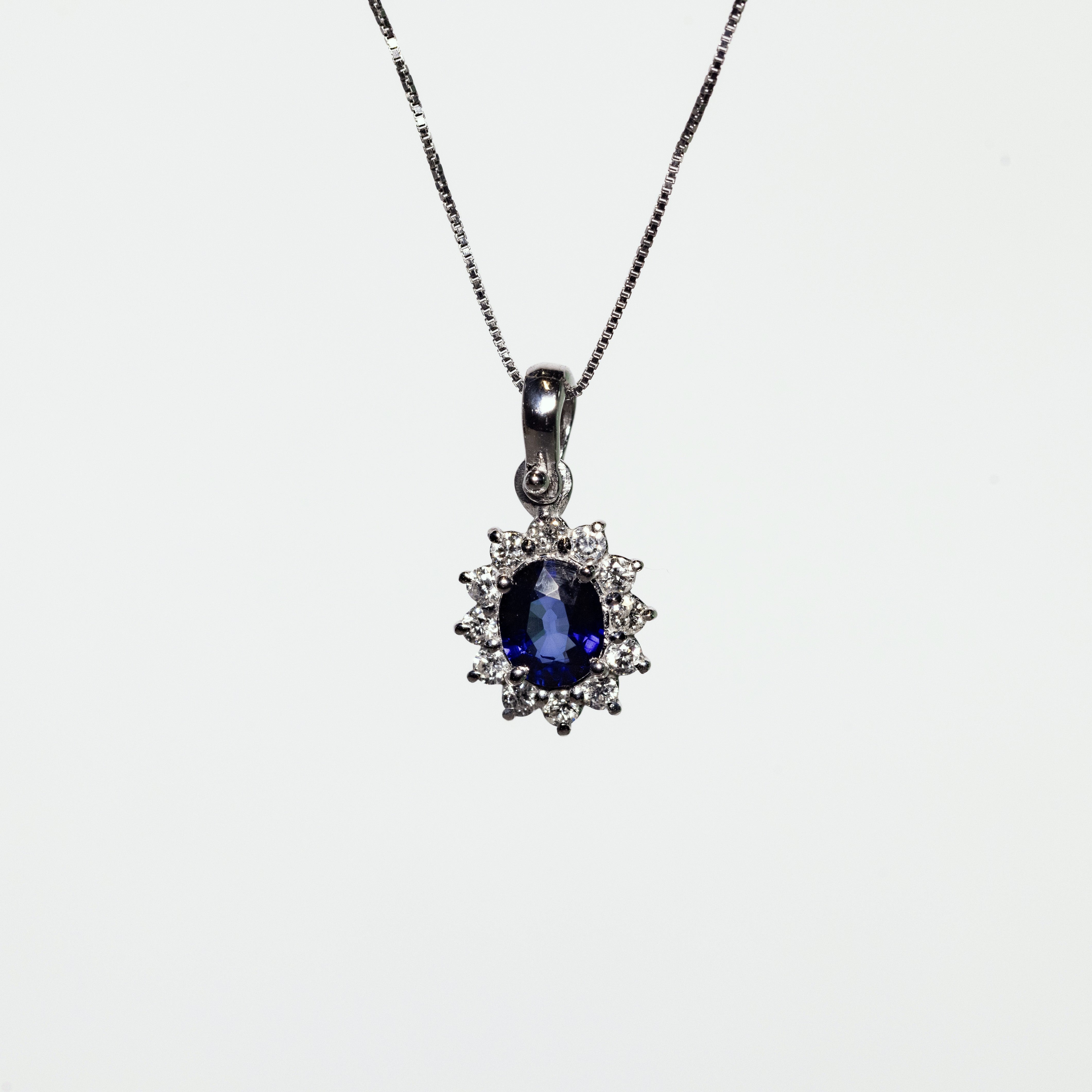 Collana In Oro Bianco 18 kt con Zaffiro Taglio Ovale con Giro di Diamanti